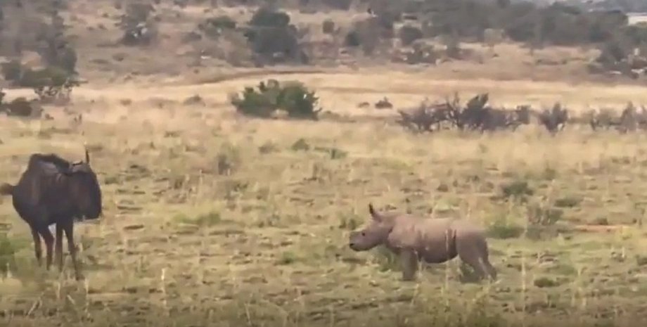 Акуна-матата в реальной жизни: детеныш носорога решил поиграть с антилопой гну (видео)»>