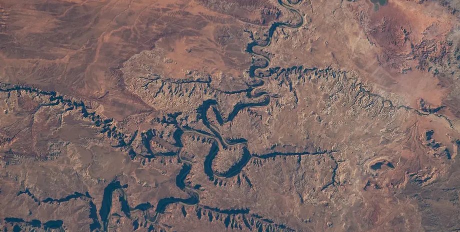 На этом снимке с МКС река Грин извивается по территории национального парка Каньонлендс | NASA…
